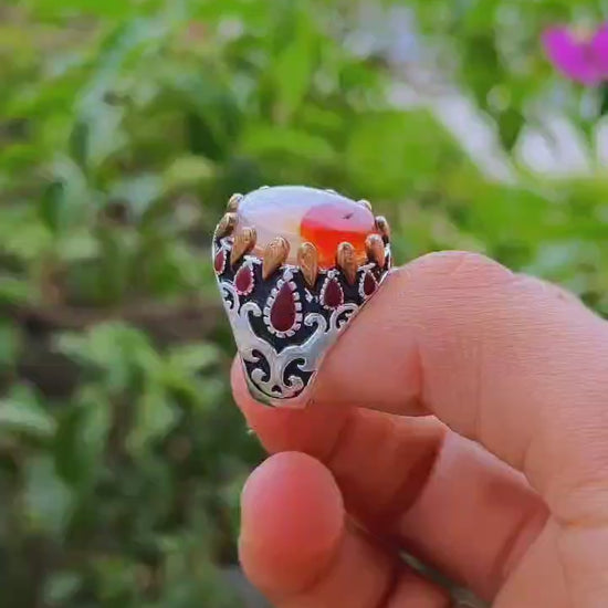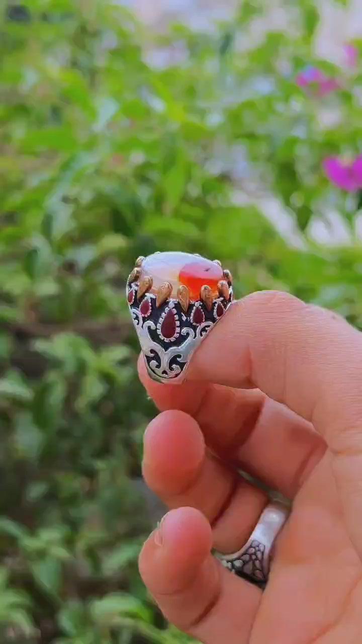 خاتم فضة فخم عيار 925، متوج بحجر العقيق اليماني المزهر المرسم الطبيعي، وهو من أندر وأجمل أنواع العقيق، يتميز بنقوشه الطبيعية التي تشبه الزهور المرسومة بدقة داخل الحجر، وكأنها لوحة فنية مصغّرة من صنع الطبيعة.