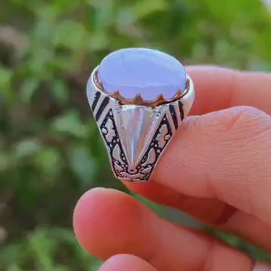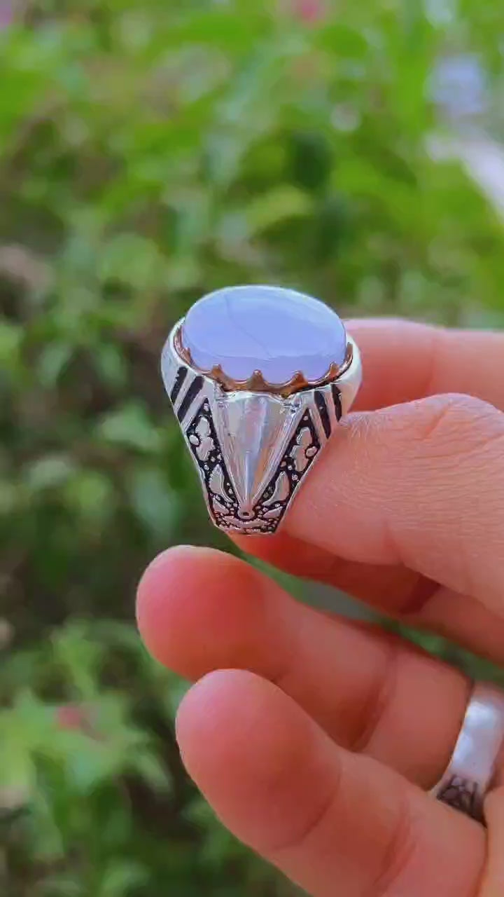 خاتم راقٍ من فضة نقية عيار 925، يتوّجه حجر العقيق اليماني السماوي الطبيعي، بلونه الأزرق الهادئ وتدرجاته الشفافة التي تُشبه صفاء السماء أو هدوء البحر في يوم مشرق.