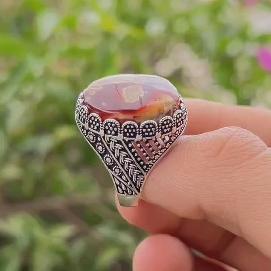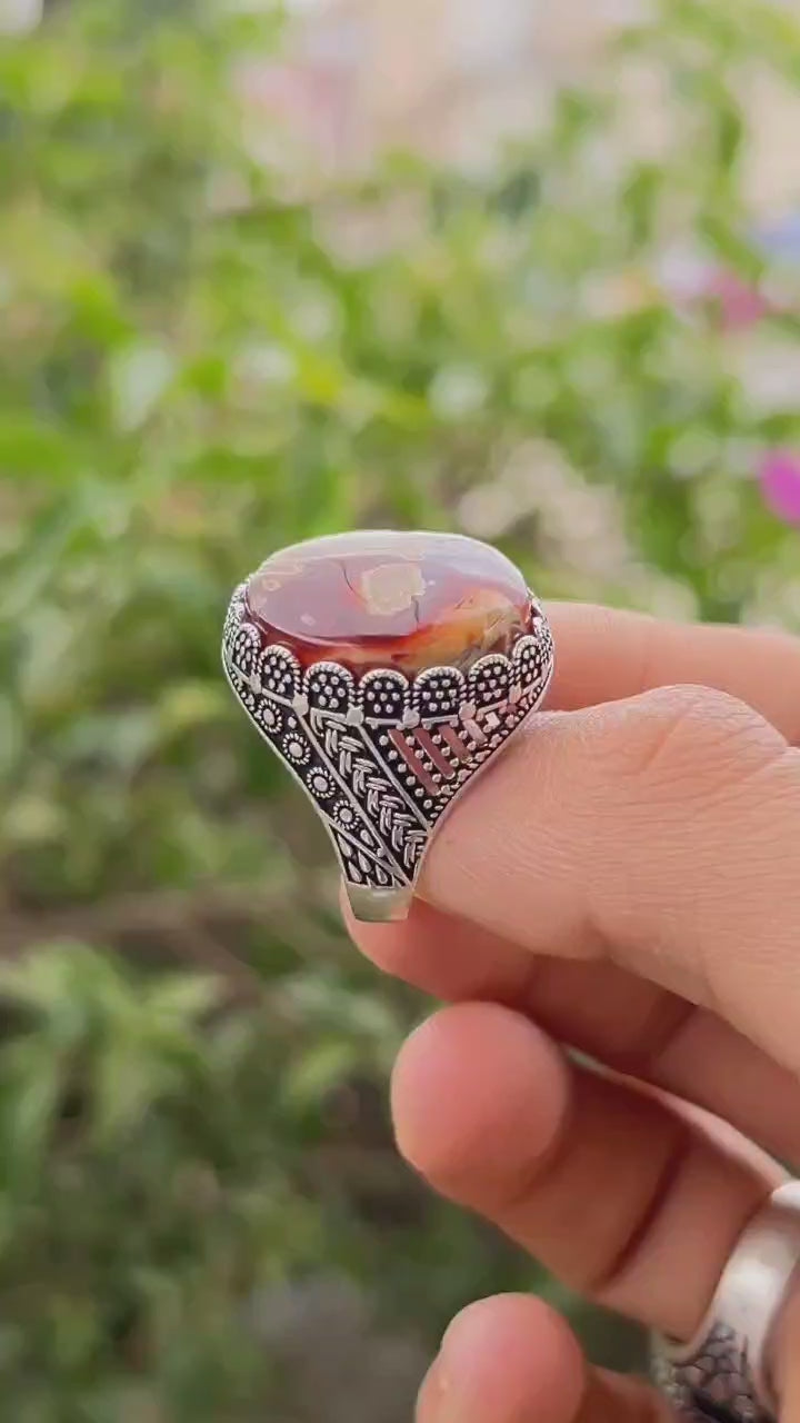 خاتم أنيق من فضة نقية عيار 925، متوّج بحجر العقيق اليماني الخرائطي الأحمر الطبيعي، المعروف بنقوشه المتداخلة التي تشبه الخرائط الطبيعية أو التضاريس الجبلية.