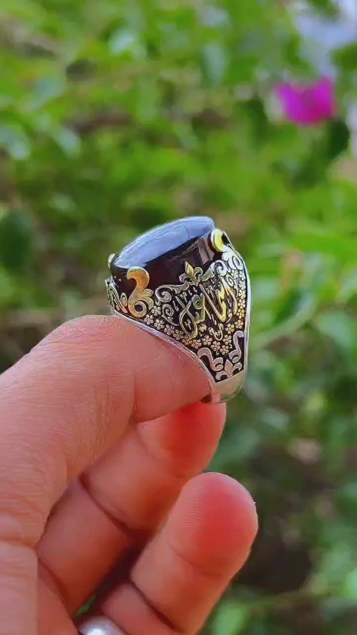 خاتم فضة فاخر شغل يدوي عيار 925، يتم تصميمه خصيصًا لك حسب الطلب، مع إمكانية نقش اسمك واسم من تحب على الحلقات الجانبية أو داخل الخاتم.
