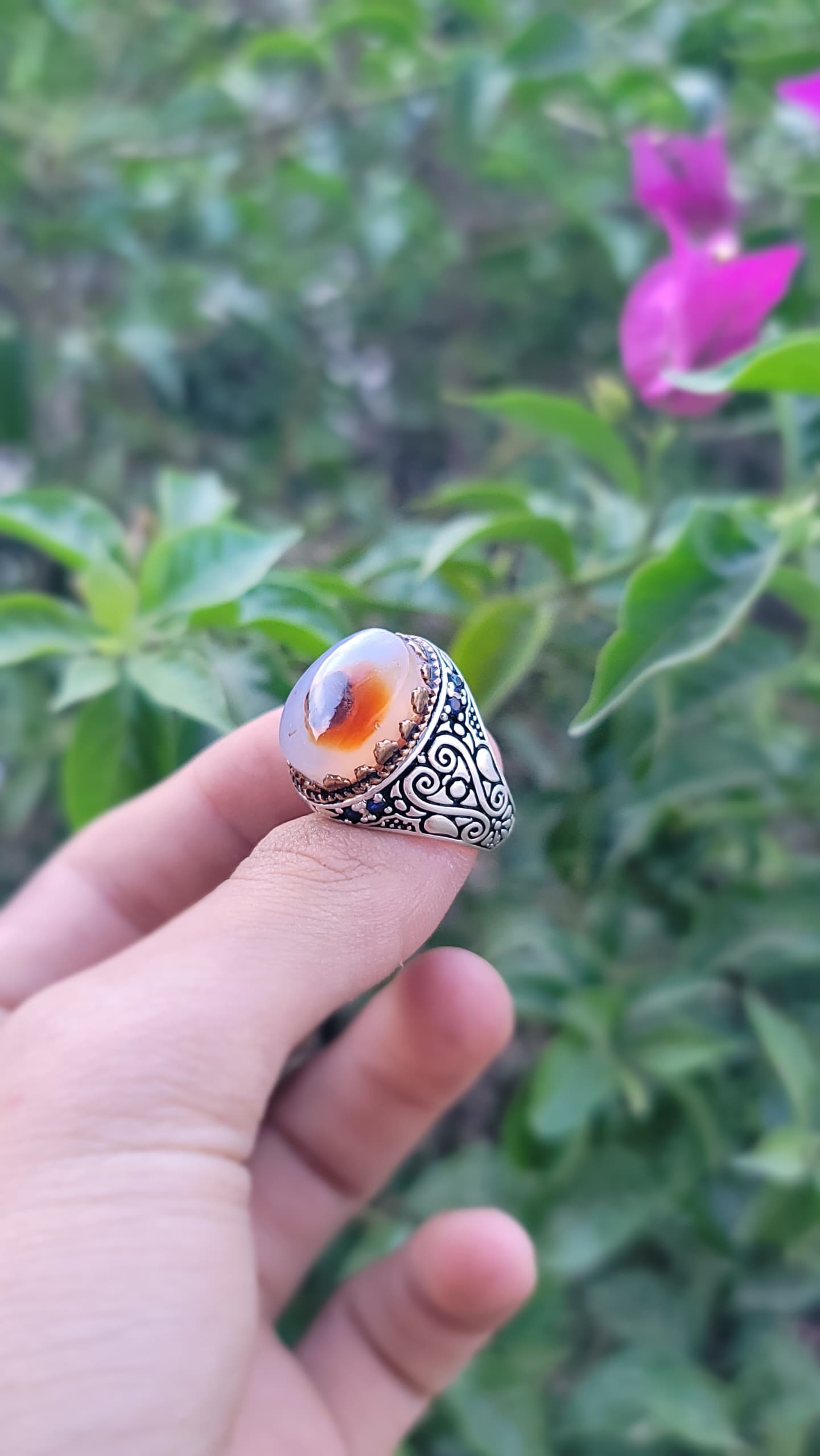 خاتم فخم من فضة نقية عيار 925، يتوّجه حجر العقيق اليماني المزهر المرسم الطبيعي، الذي يتميز بنقوش دقيقة تشبه الزهور أو الزخارف النباتية، وكأنها مرسومة بريشة فنان داخل الحجر.