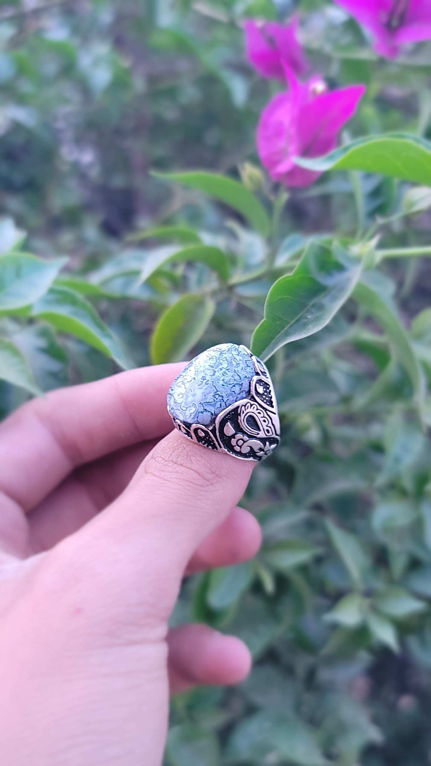 خاتم أنيق من فضة نقية عيار 925، مرصّع بحجر العقيق اليماني الخرائطي الأزرق الطبيعي، الذي يتميز بتدرجات لونية زرقاء هادئة ممزوجة بخطوط طبيعية دقيقة تشبه الخرائط أو الرسومات الجيولوجية.