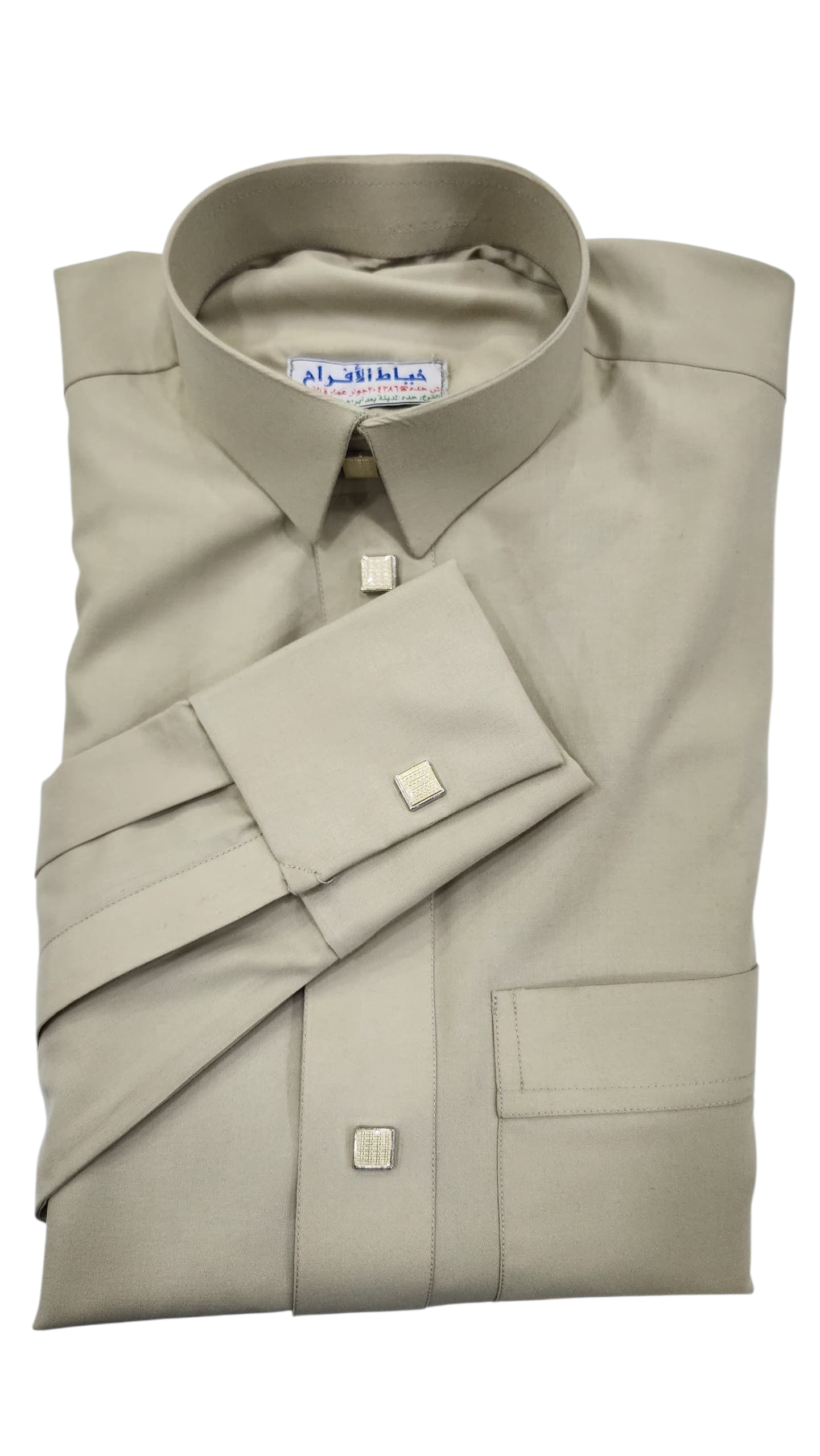 Thobe Description: This elegant men's thobe features a refined design that blends tradition with sophistication. It is presented in a light sandy beige color with a small royal lapel collar, adding a touch of regal elegance. The thobe showcases a hidden snap button (taqtaq) closure at the front for a seamless and clean appearance. The sleeves are designed with a double fabric layer, enhancing the thobe's luxurious feel, and are finished with distinctive square cuff links. The design is completed with a single breast pocket reinforced with interfacing to maintain its sharp shape, along with practical side pockets for ultimate convenience. The fabric appears soft and comfortable, making the thobe ideal for special occasions and days that call for a distinguished look.