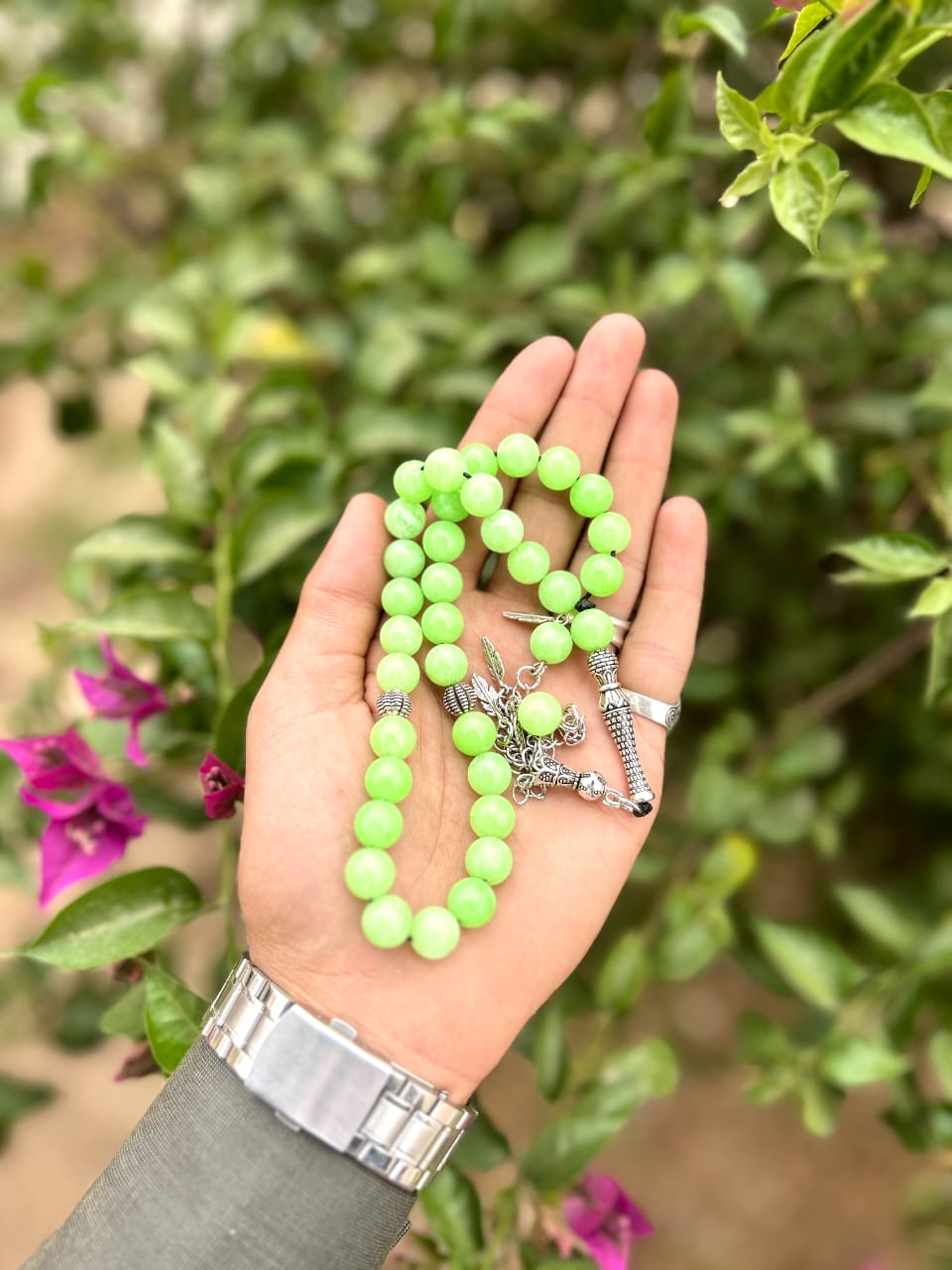 Product Details: This captivating Misbaha is meticulously crafted from authentic Natural Indian Agate stone, celebrated for its beauty and durability. It features beads in a stunning vibrant lime green color, a truly energetic and eye-catching hue achieved through specialized coloring processes that enhance its brilliance while preserving the stone's inherent natural properties. Each bead boasts a radiant luster, perfectly complemented by the finely detailed bright accents and the exquisitely ornate polished Imam (leader bead).